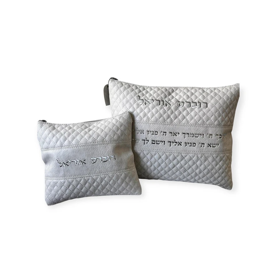 סט כיסויים לטלית ותפילין בצבע אפור אבן עם הבלטה כסופה של ברכת הכהנים