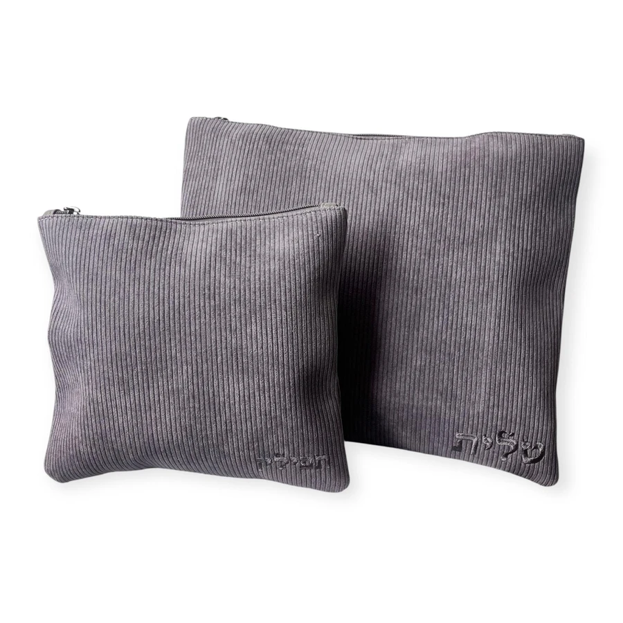 סט כיסויים לטלית ותפילין מבד קורדרוי בצבע אפור עכבר